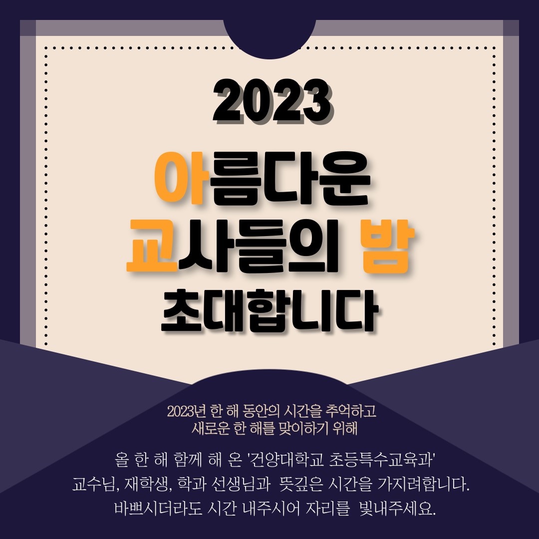 『 2023학년도 아교밤 (아름다운 교사들의 밤) 행사 안내 』글의 상세내용을 확인하는 표로 제목, 부서명, 등록일, 조회, 첨부, 내용으로 나뉘어 설명합니다.