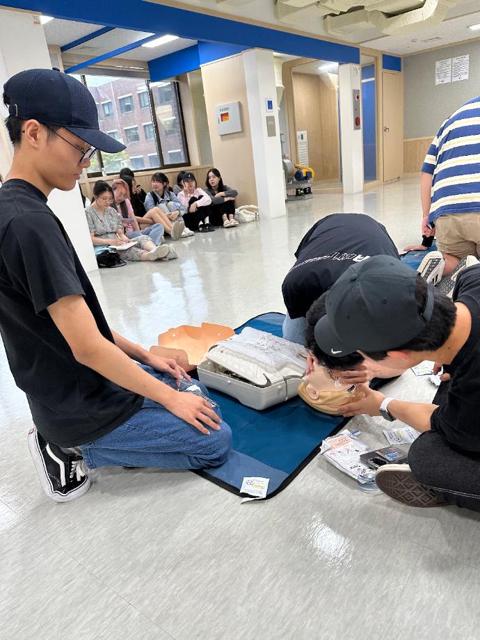 3주차에는 융합디자인학과 학생들도 함께 참여하여 교육 및 실습을 진행하였습니다~ 마지막 주차인 만큼 가슴압박, 인공호흡, 자동심장 충격기(AED)를 모두 실습했습니다. 3주동안 잘 따라준 23학번께 감사드리며 교육을 진행해준 19학번 신수인, 표상운, 권순찬 20학번 배현준 학생에게 무한한 박수를 드립니다~ |