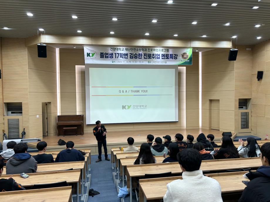 재난안전소방학과 졸업생 17학번 김승한 선배의 진로취업 멘토특강이 있었습니다. 참석인원으로는 재난안전소방학과 재학생들과 최승규 교수님께서 참석해주셨습니다. 후배들을 위해 조언과 격려를 해주신 17학번 김승한 선배에게 감사드리며, 바쁘신 와중 참석해주시어 훈화말씀 해주신 최승규 교수님께 감사의 말씀 전합니다. |